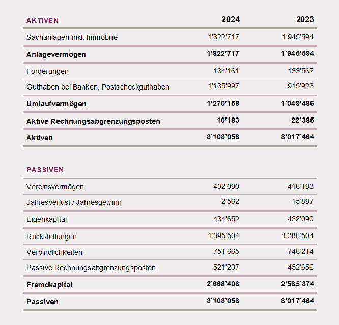 Es resultierte 2024 ein knapp positives Gesamtergebnis von 2‘600 Franken (2023 16‘000 Franken). Die Eigenmittel erhöhten sich in der Folge ganz leicht auf 435‘000 Franken (2023 432‘000 Franken).