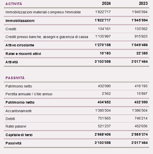 Per il 2024 ne consegue un risultato leggermente positivo di 2.600 franchi (2023: 16.000 franchi). Di conseguenza, il patrimonio netto è leggermente aumentato passando a 435.000 franchi (432.000 franchi nel 2023).